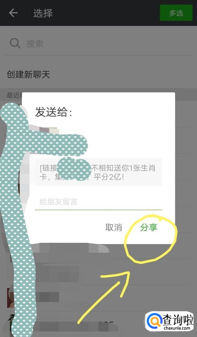 打开微信后,选择一个好友,点击分享即可。(也可以加上想要对好友说的话),如下图所示。