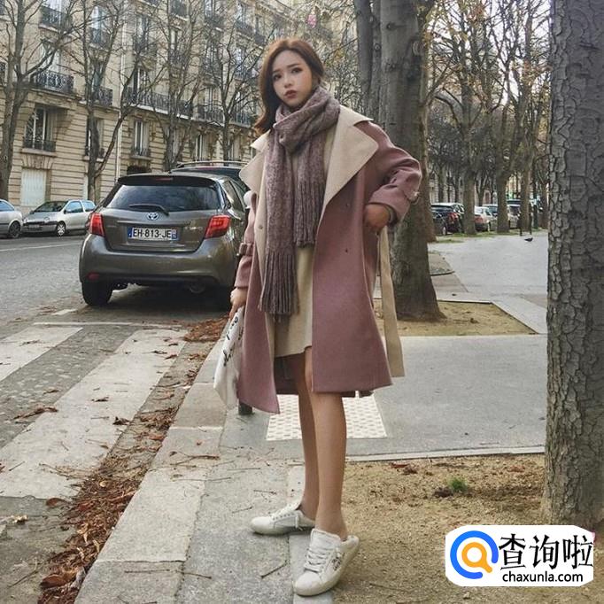 豆沙色大衣配白色T恤。这样的搭配看起来非常的清新,再搭一条白色的裤子简直太清纯了。