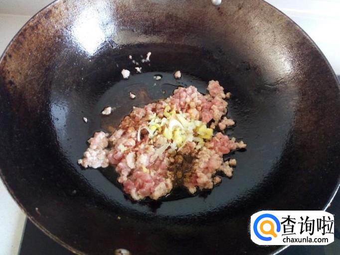 油热后倒入肉末,随即倒入少许酱油,避免肉末下油。放入葱,姜,五香粉,翻炒一下。