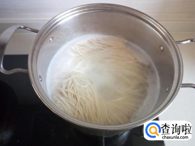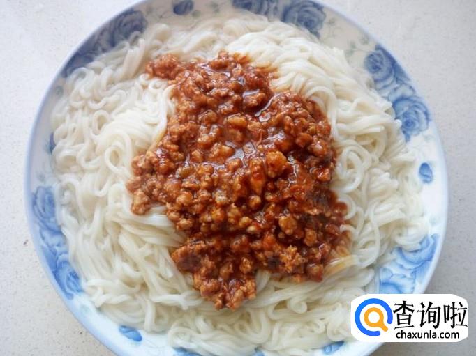 用锅煮面,面煮好后盛入盘中,把香辣酱浇在面上,可口的香辣肉面就做成了。