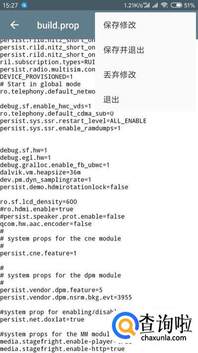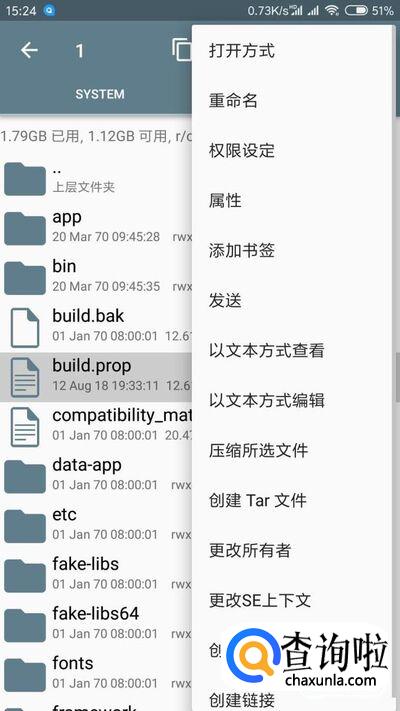 在根目录的system文件夹里面找到build.prop文件夹,长按选择文本方式编辑。