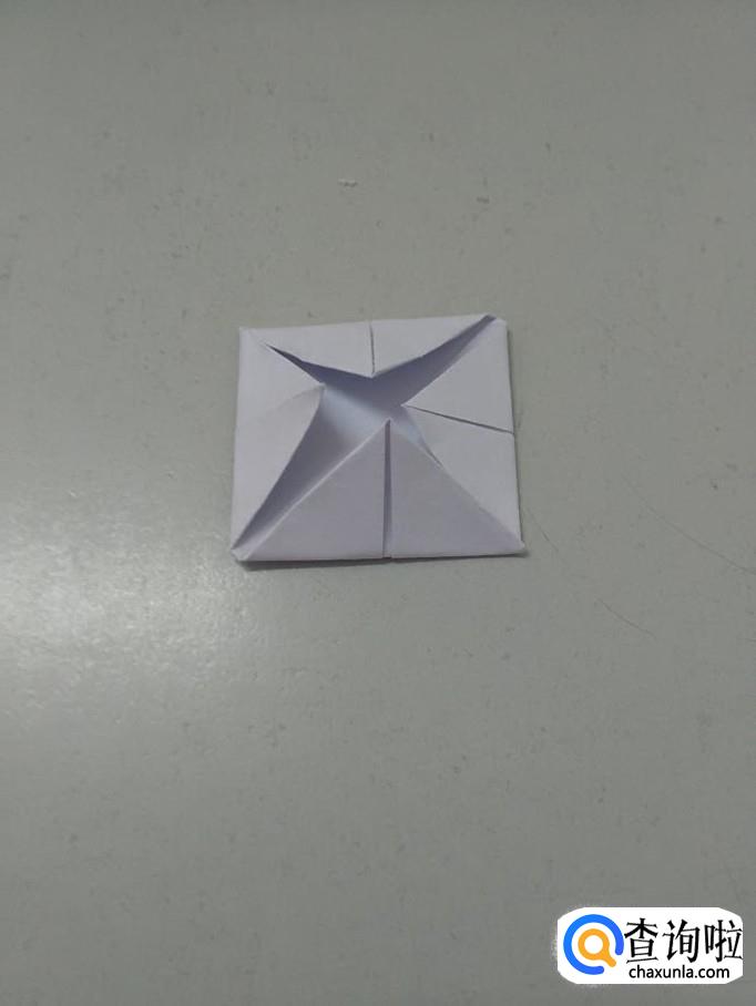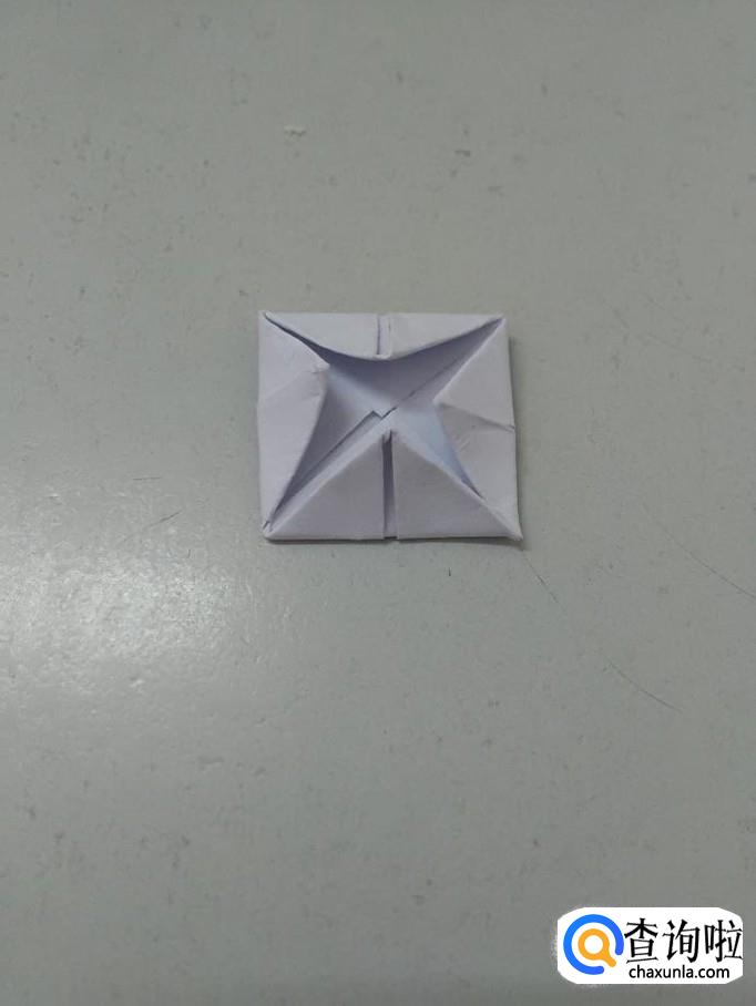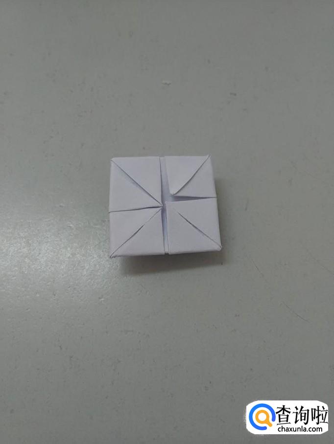 再把纸反过来,是下面左图的样子,把四个角分别向外面打开,打开后,得到四个长方形。