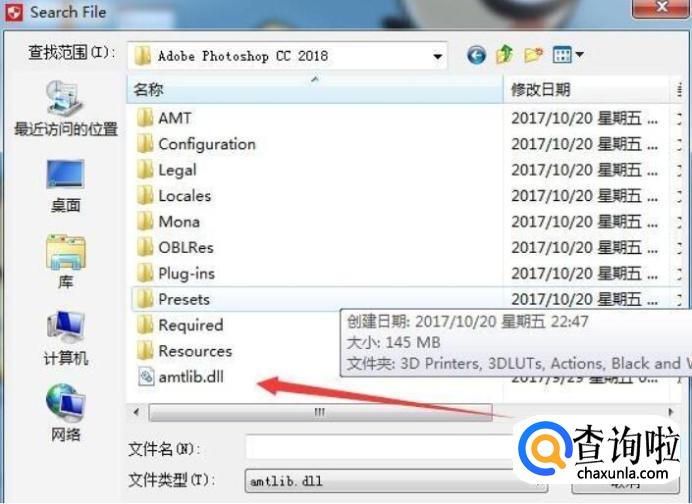 在弹出的对话框中,如果是默认路径就打开C:ProgramFilesAdobeAdobePhotoshopCC2018,找到后选择软件根目录下的amtlib.dll,双击打开。如果你以前修改过Adobecc2017系列软件的安装位置就去那找到AdobePhotoshopCC2018文件夹。