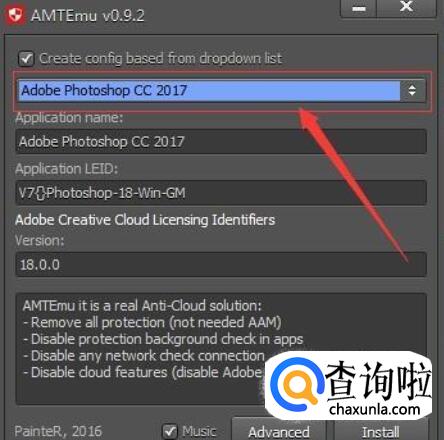在注册机第一个选项卡中选中AdobePhotoshopCC2017,亲测可以破解CC2018,然后点击Install。