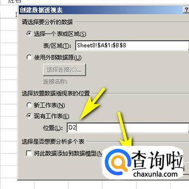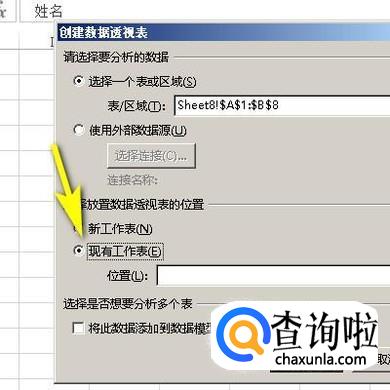 这时,弹出一个创建数据透视表的操作面板。如下图所示,点选: 现有工作表