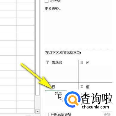 在工作表的右侧这里即时显示出“数据透视表字段”窗口。把鼠标放在“姓名”这里,鼠标呈四向箭头状,