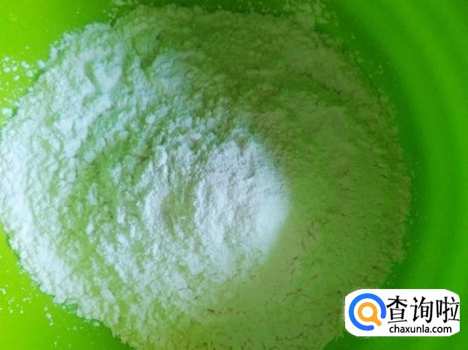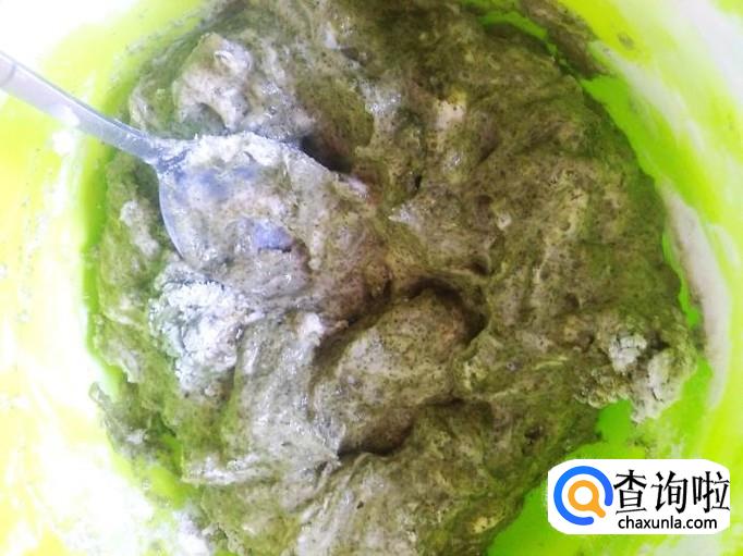 糯米粉放盘子里,然后把艾叶糊倒进去,加适量的白糖搅拌均匀。