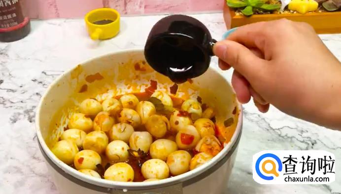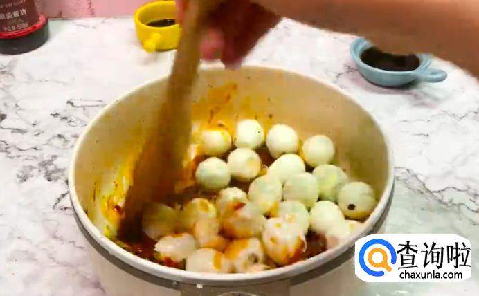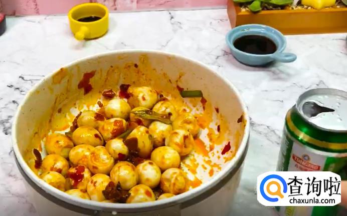 翻炒一会之后,将剥好的鹌鹑蛋下锅,然后加适量啤酒,继续翻炒。