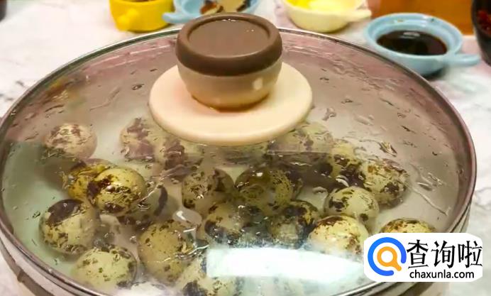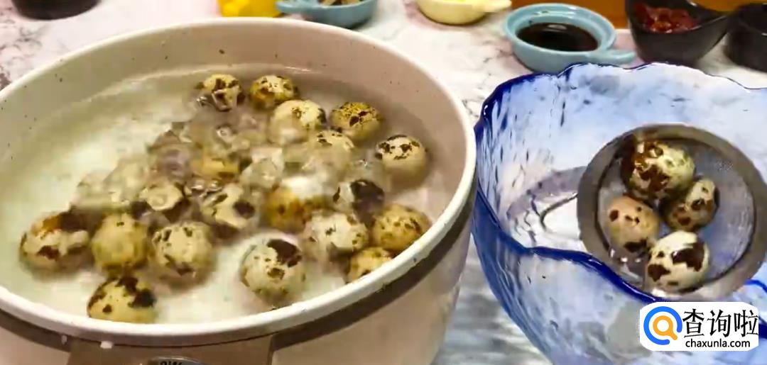 接着,将煮好的鹌鹑蛋捞出来,放入凉水中浸泡一下。