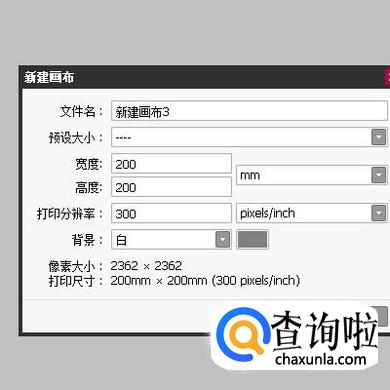 在弹出的新建画布对话框,设置高度和宽度都是200的画布。