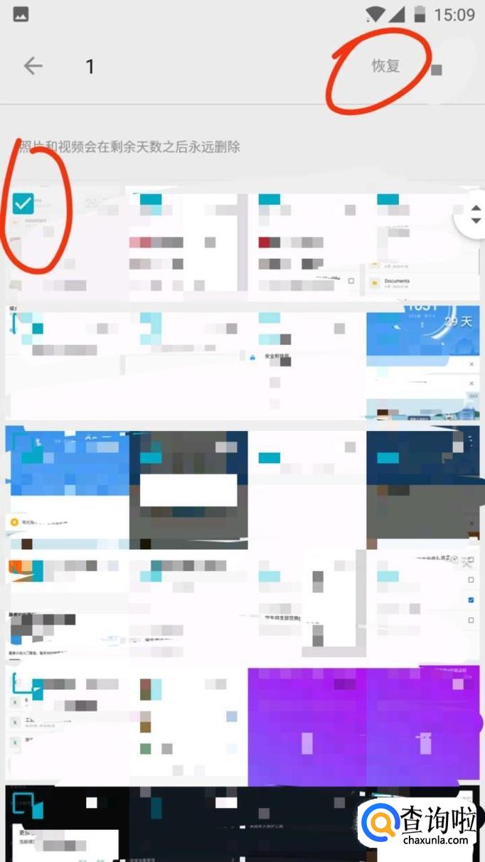 进入后,有许多最近删除的照片,长按你要恢复的那个照片,会出现勾选项,勾选你需要恢复的照片,点击右上角“恢复”