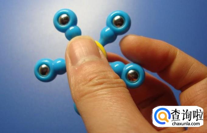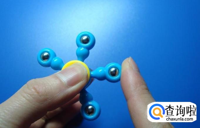 指尖陀螺有两片旋转叶和多片旋转叶的,这里用五片旋转叶的指尖陀螺来给大家演示指尖陀螺花式玩法。从简单的玩法开始,锻炼一下手指的灵活性。 把指尖陀螺用左手的手指拿住,右手进行拨动,这是双手玩指尖陀螺的玩法,如下图所示。