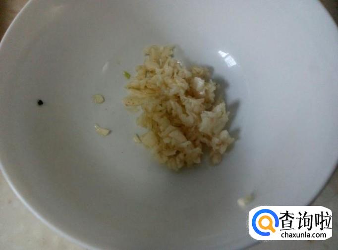 然后可以拿五个蒜瓣儿。剥好以后,放在案板上用刀背去拍蒜,直到把蒜瓣儿拍扁即可。