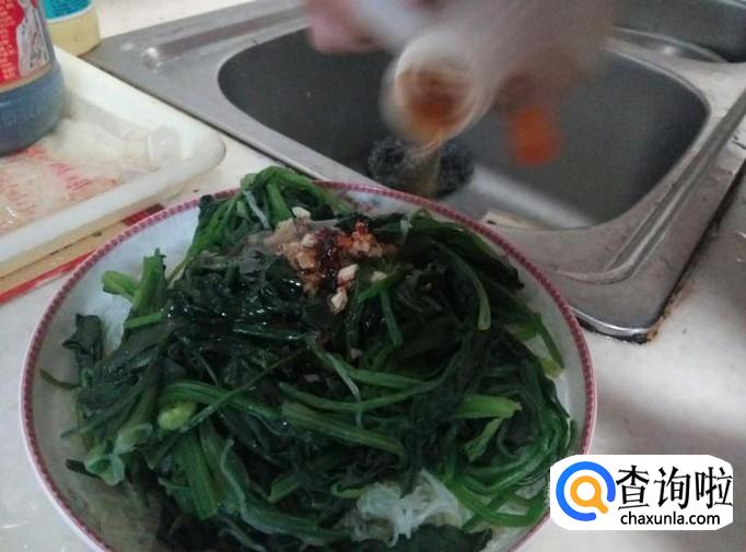 把蒜瓣儿放到菠菜粉丝里,然后依次倒入辣椒面和盐醋,酱油等调味料