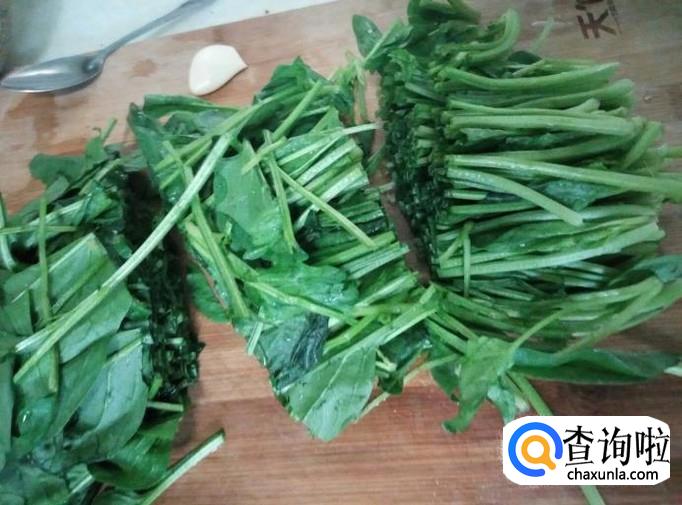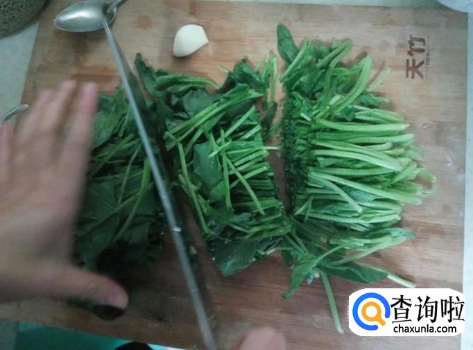 清洗干净菠菜后可以将菠菜放到案板上直接用刀将其分割成等分的三份即可。