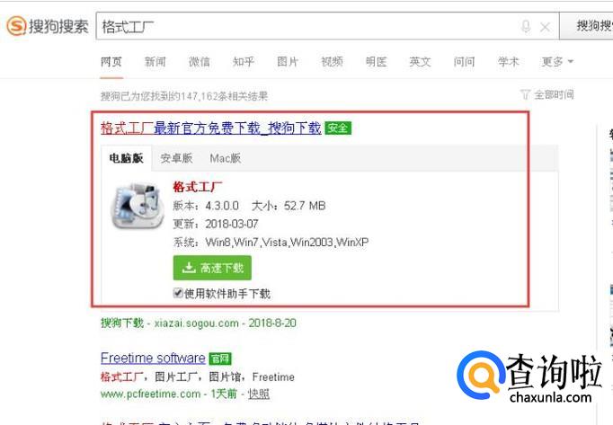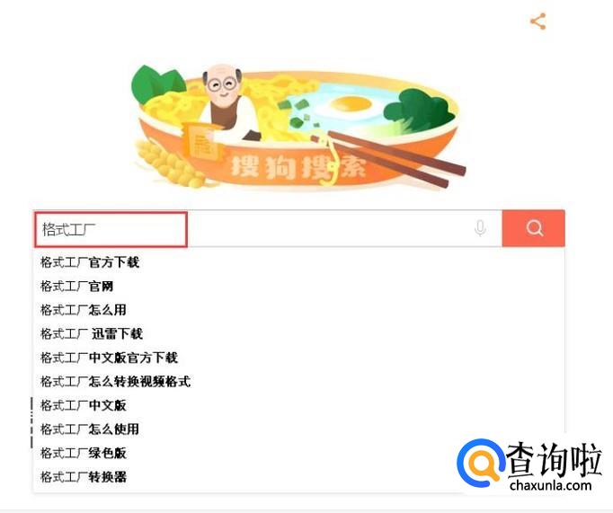 首先打开搜狗浏览器,输入“格式工厂”点击搜索。