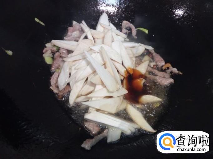 炒至肉片颜色微白,放入料酒,葱,姜,蒜,翻炒,随即放入杏鲍菇翻炒,放入一小匙儿蚝油。