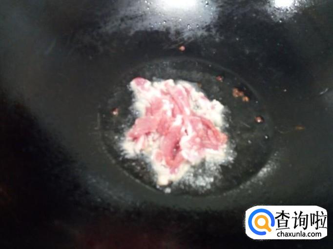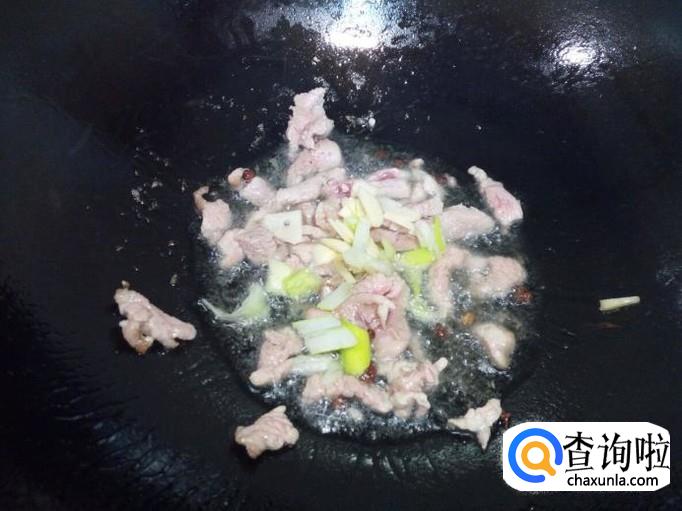锅里放入油加热,油热后放入花椒爆锅,放入肉片翻炒。