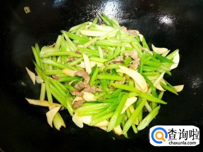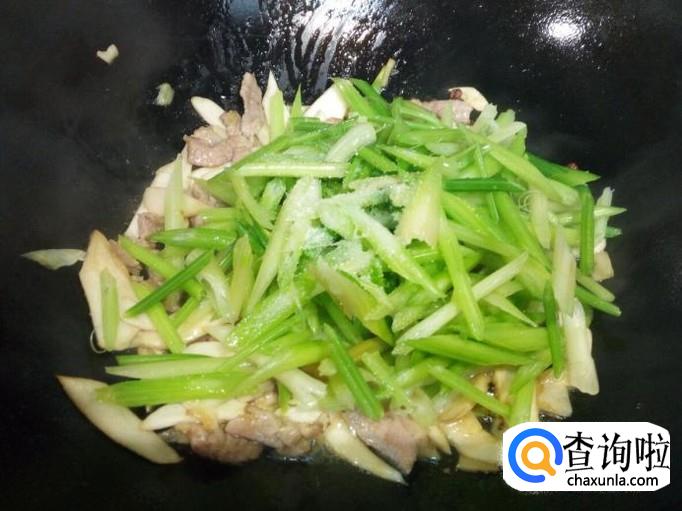 炒至杏鲍菇变软,放入香芹翻炒,滴少许醋,放入盐。炒至香芹断生,放入味精,关火出勺。