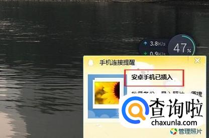 将手机插上数据线并连到电脑上,电脑会显示安卓手机已插入