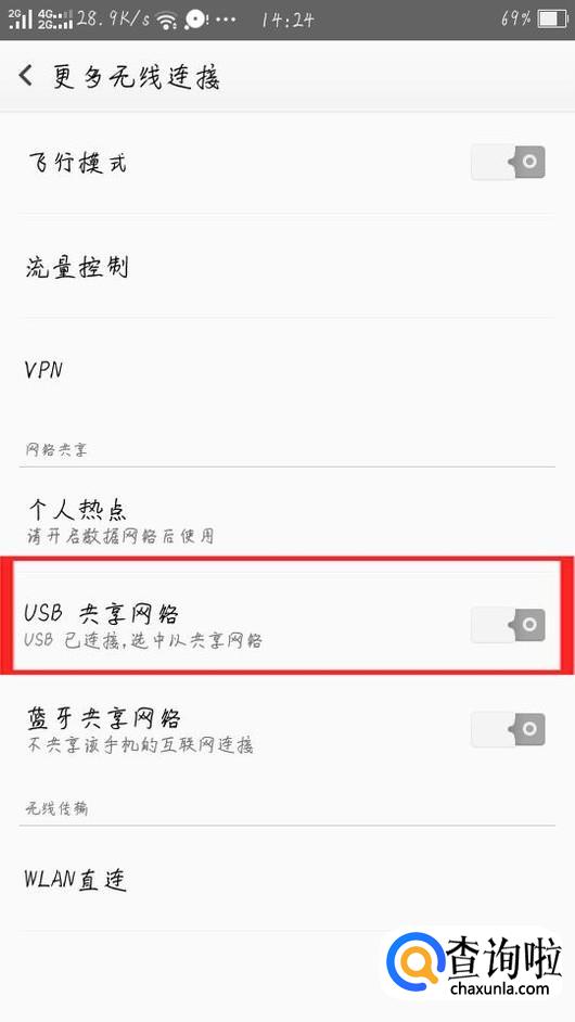 进入更多界面后,将“USB共享网络”的开关打开,这样电脑就联网啦!
