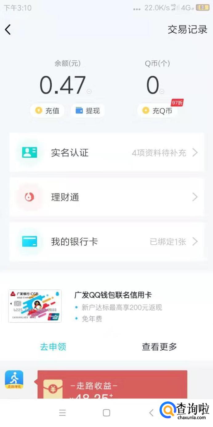 找到QQ的我的钱包功能,然后点击进入,找到实名认证,进入。