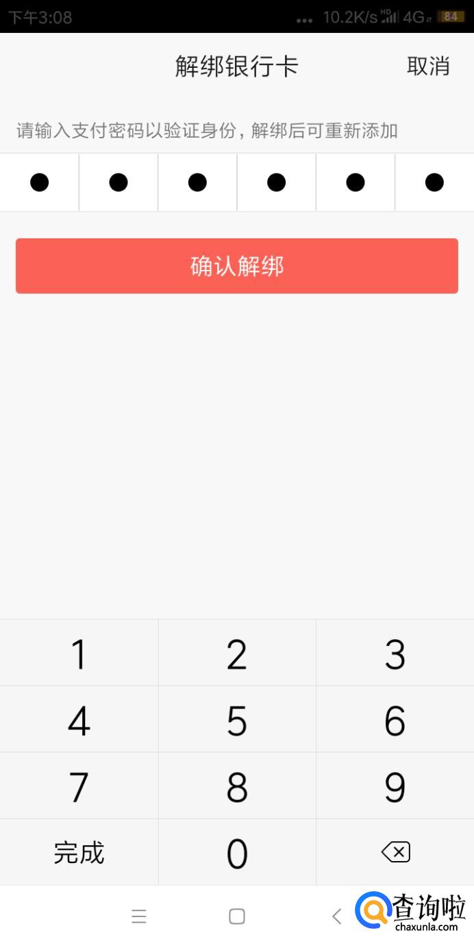 然后输入之前设置的支付密码,就可以解绑银行卡了。