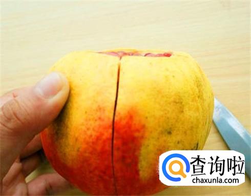 用刀将石榴就像是切苹果片那般一片片划开,或者是直接切两刀,让石榴呈现四瓣。