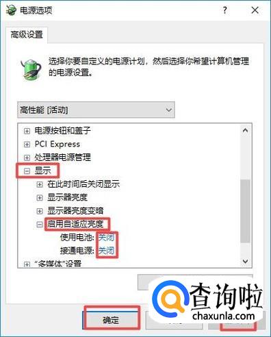 弹出的界面,我们点击打开显示,然后点击打开启用自适应亮度,之后我们将里面的两个选项全部设定为关闭,然后点击应用,之后点击确定就可以了。