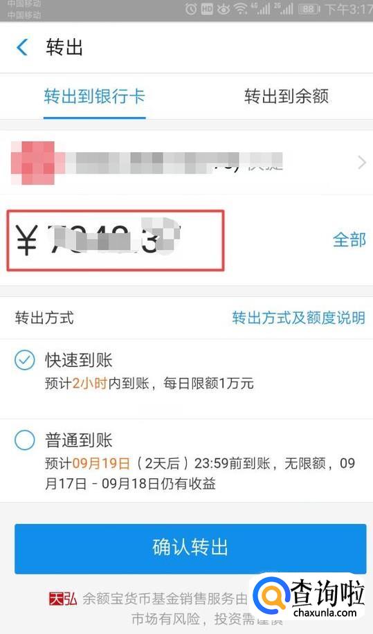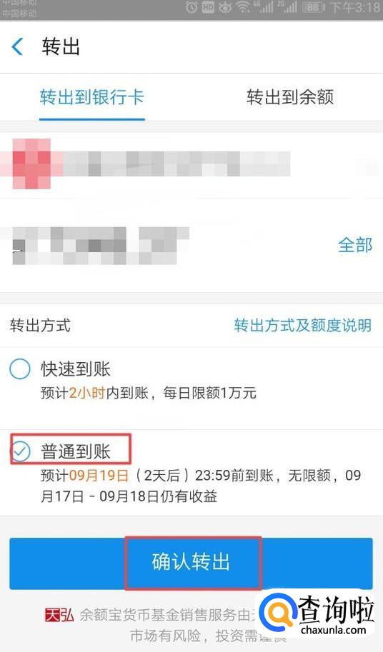 之后我们点击选中普通到账,因为快速到账是限额的,我们是无法取出大额的,之后我们点击确认转正,然后输入密码进行转账就可以了。