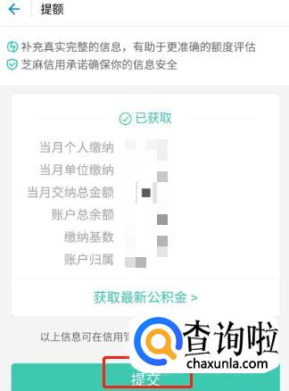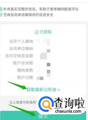 然后进入如下界面,点击【获取最新公积金】,或者直接点击【提交】。(点击提交的前提是你在“个人信息”中已经验证过公积金)。