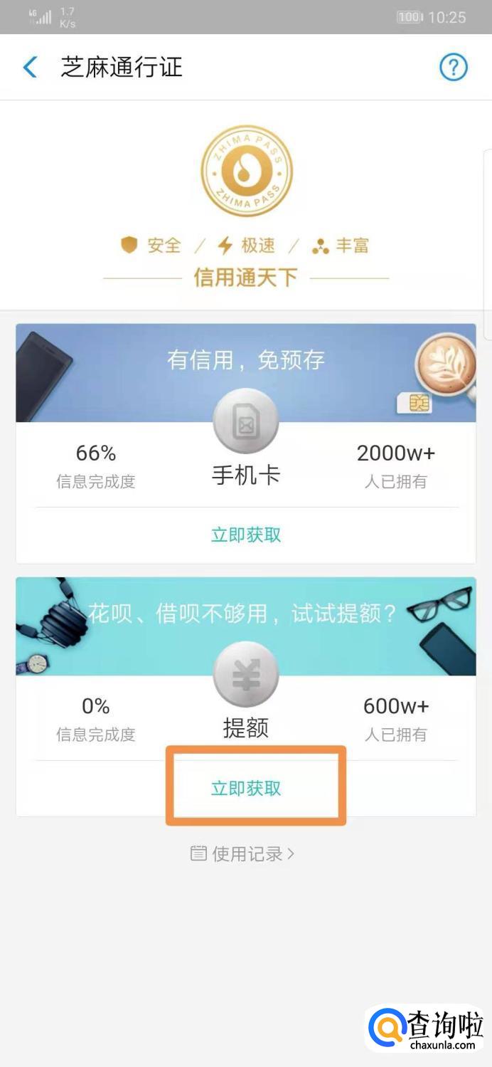 在【芝麻通行证】界面中点击下图所示的【立即获取】。