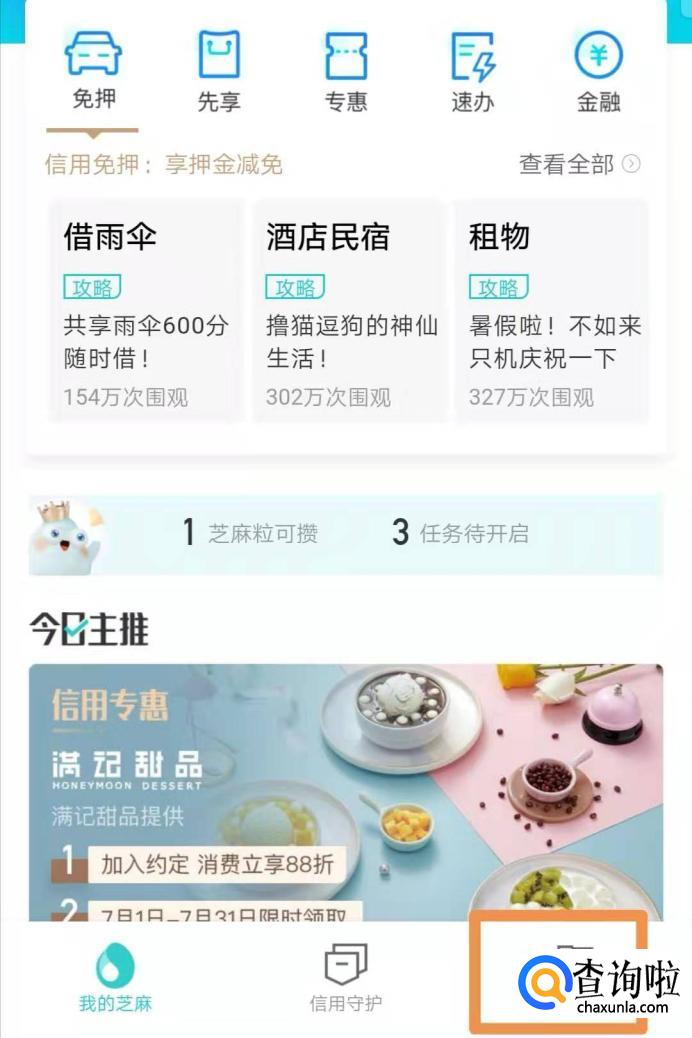 首先我们打开手机支付宝app,选择页面底端的【我的】,再点击相应页面的【芝麻信用】。