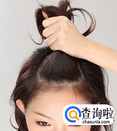 然后将分好的头发上半部分用皮筋扎起来,如果想要蓬松感比较强的,可以用梳子将头发打毛,然后用皮筋固定好。