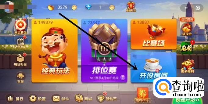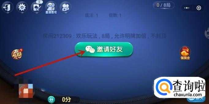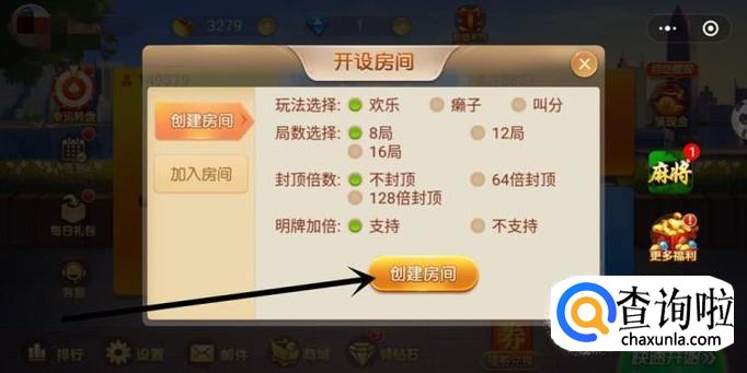 进入之后,设置玩法、局数、封顶倍数以及明牌加不加倍,点击“创建房间”,如图所示。