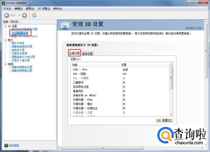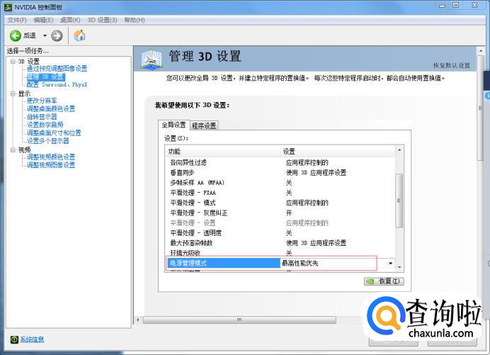 看到管理3D设置里的全面设置,将全面设置的下方的电源设置改为最高性能设置。
