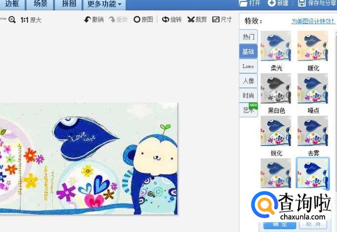 点击右侧基础特效中的去雾功能,然后点击确定,画面上的雾就被去掉一些了。