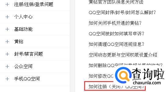 在帮助中心里面,点击如何注销和关闭QQ空间,如图所示。
