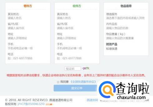 会出现如图所示的页面,然后准确填写收件人和寄件人信息,输入物品信息,填写验证码,勾选同意协议,最后点击提交订单就好啦。
