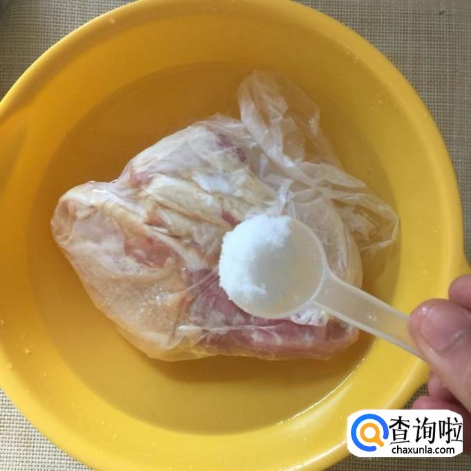 接着往盆子当中加入适量的食用盐,把肉浸泡五分钟左右就会自动解冻了。