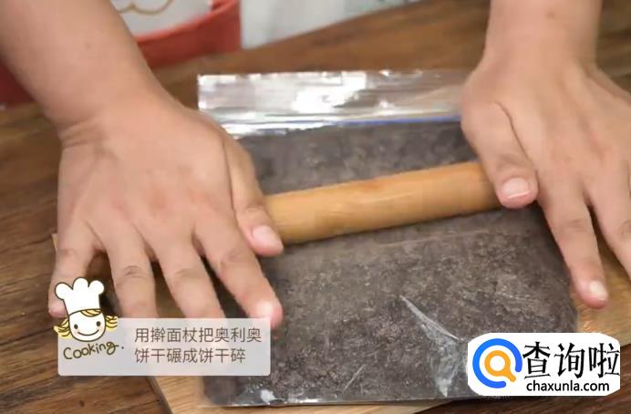 将饼干放入食品袋中,用擀面杖把奥利奥饼干碾成饼干碎。