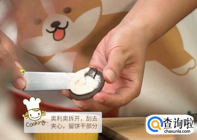 将奥利奥饼干拆开,用刀刮去夹心,留饼干部分。
