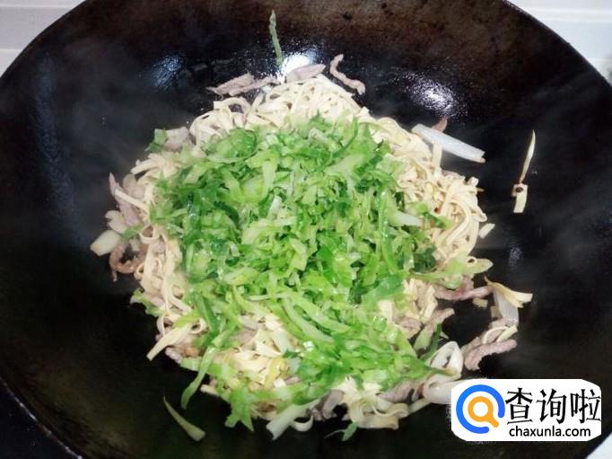 炒至肉丝颜色微白,放入料酒,葱,姜,蒜,翻炒。随即放入干豆腐翻炒,放入少许酱油,放少许水。