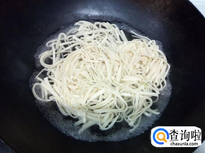 干豆腐用水焯一下,水开后入锅30秒钟捞出,沥干水分。