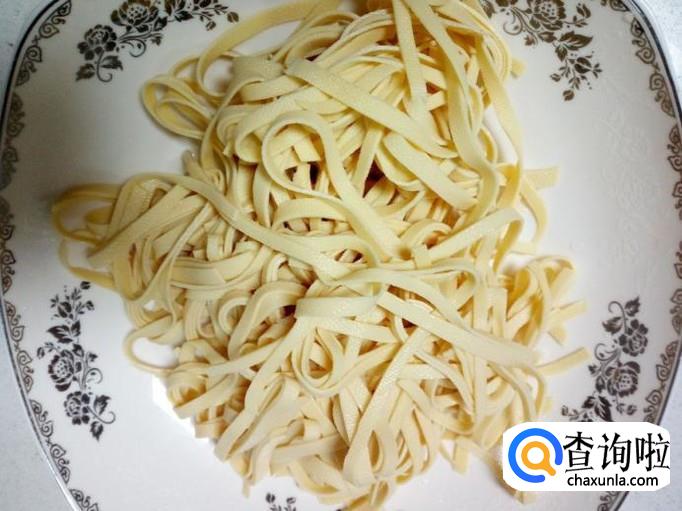 干豆腐用水冲洗一下,控干水分,切成丝。