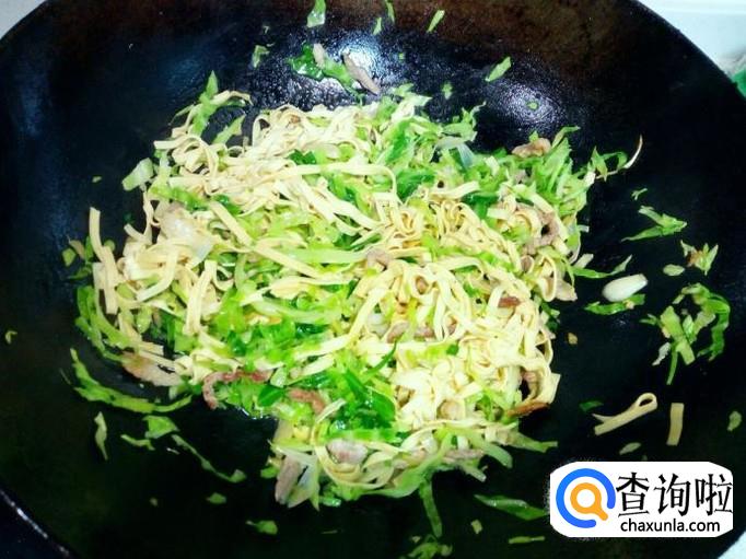 干豆腐翻炒一分钟的时间,放入甘蓝翻炒,放入盐。甘蓝经水焯过,略翻炒一下即可,放入味精,关火出勺。
