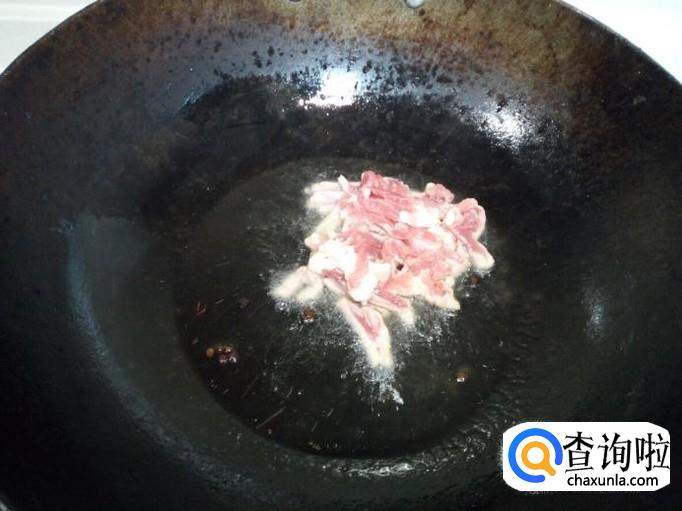 锅内放入油加热,油热后放入花椒爆锅,放入肉丝翻炒。