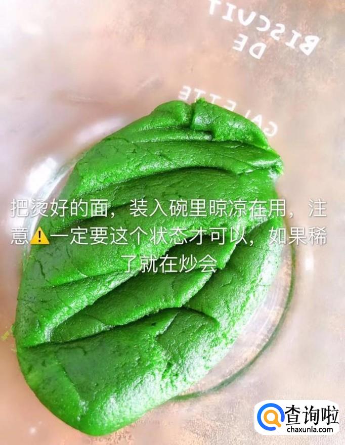 然后把烫好的面装入碗里,放凉备用,如下图所示。小贴士:1.如果面比较稀。小编建议大家再炒一下。2.面必须炒到,如下图的状态。