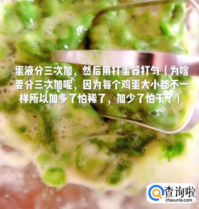 接着蛋液分三次加入碗中,用打蛋器打匀,如下图所示。小贴士:小编这样做是为了防止蛋液加多了会变稀,加少了又怕干了的情况发生。