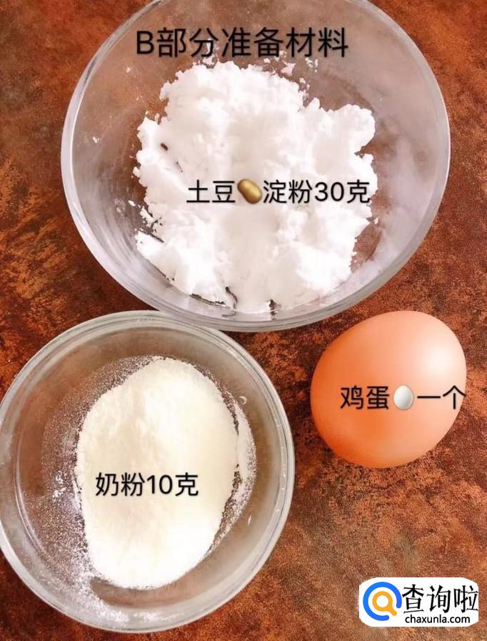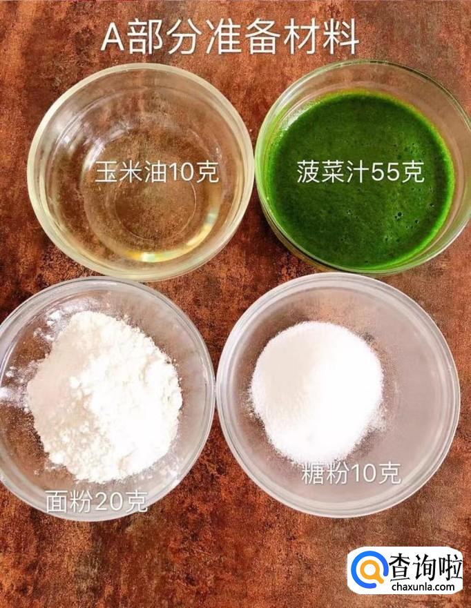 食材:玉米油10克,菠菜汁(红曲,南瓜泥)55克,面粉20克,糖粉10克,土豆淀粉30克,奶粉10克,鸡蛋一个。